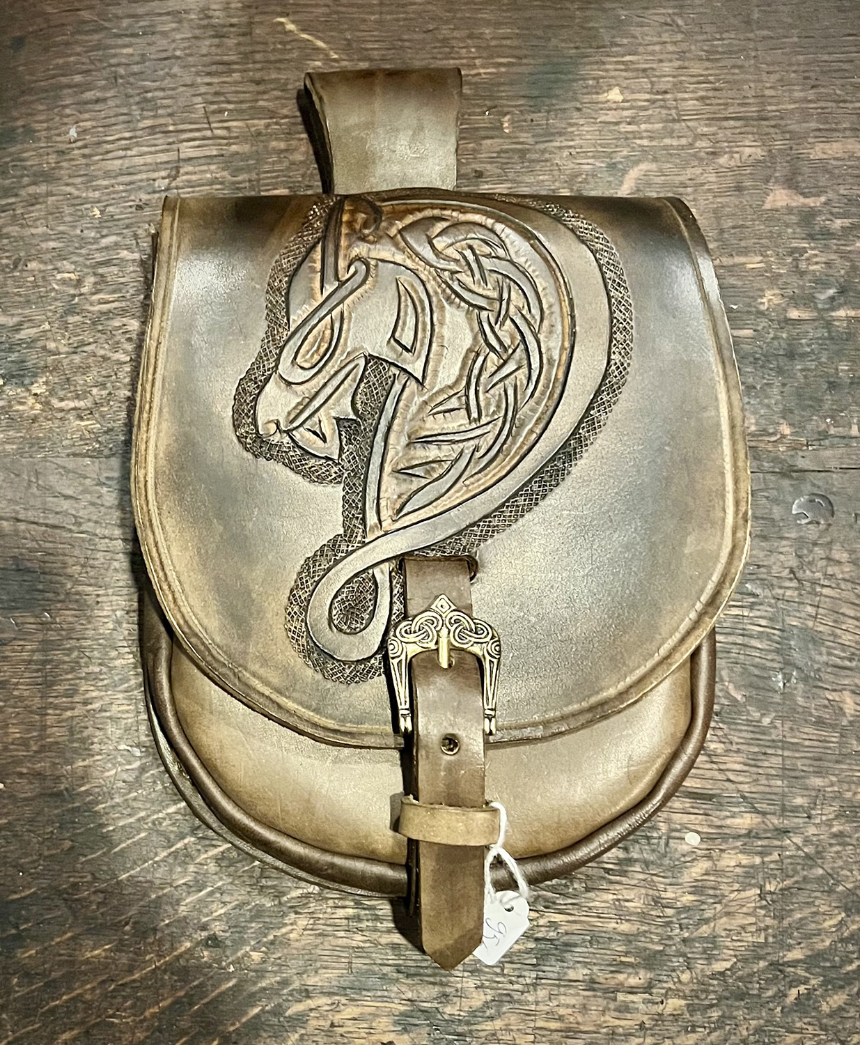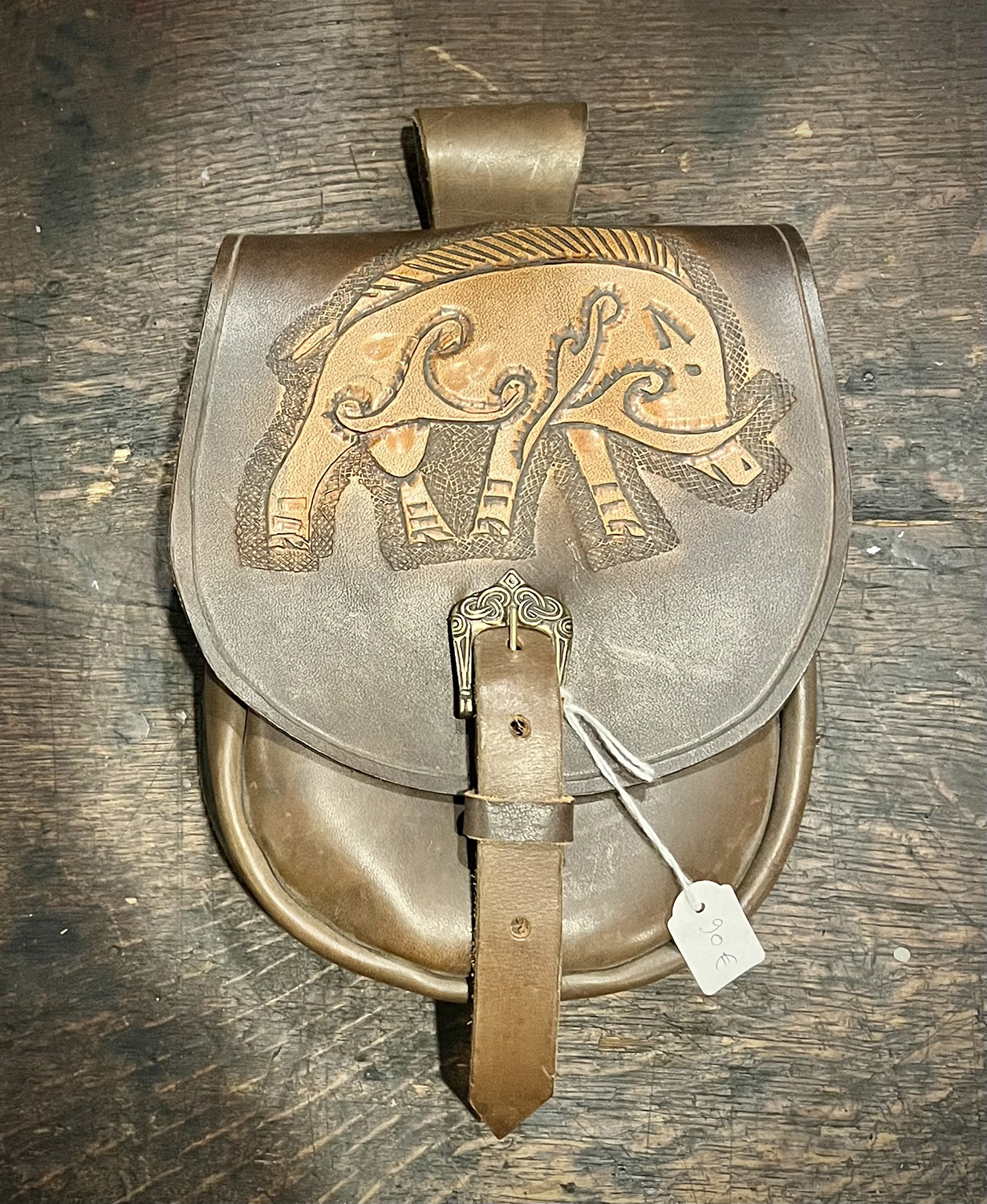 Superbe escarcelle en cuir rigide, à porter à la ceinture, décorée d'un motif en repoussé. Avec un compartiment intérieur.