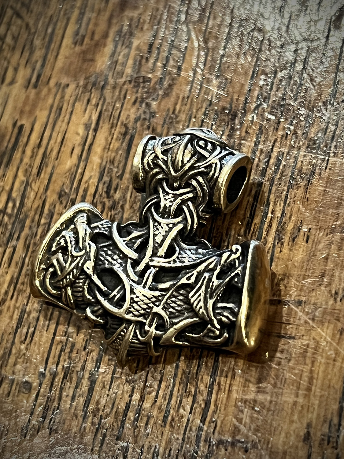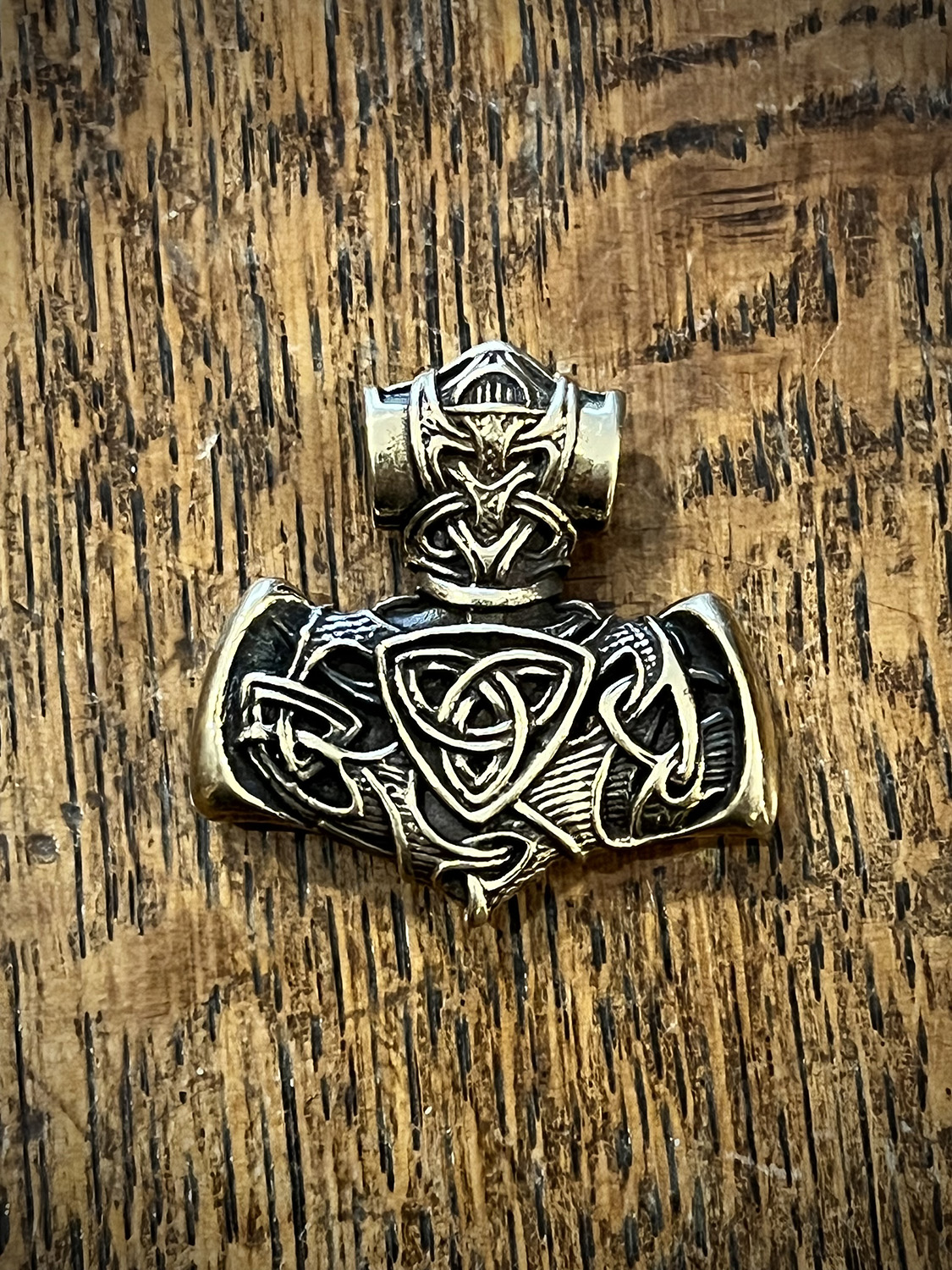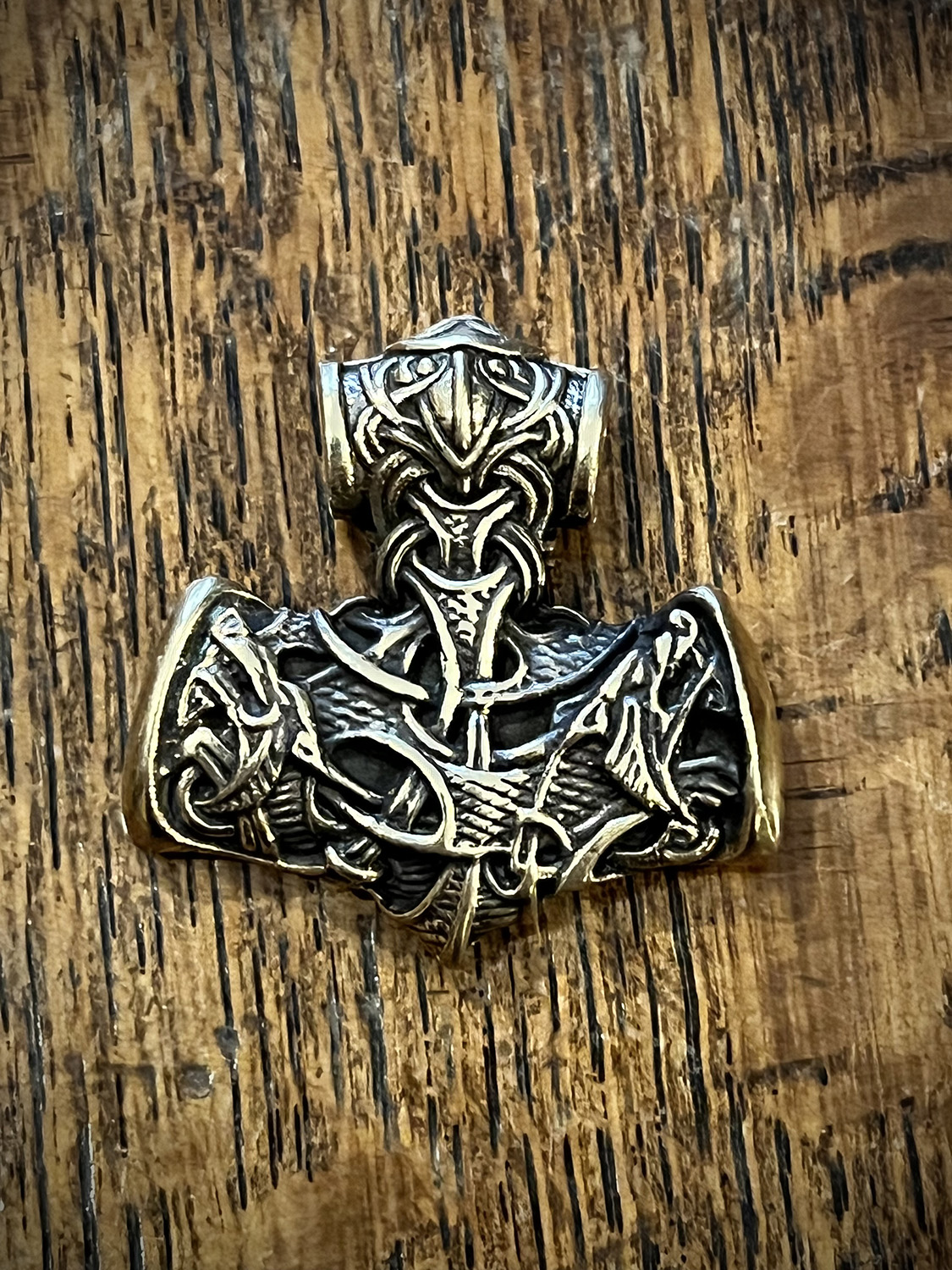 Représentation moderne du Marteau de Thor, gravé recto-verso. Le motif présente deux têtes de loups symbolisant Geri et Freki, compagnons du dieu Odin.