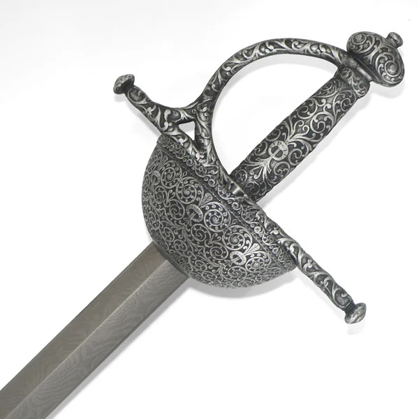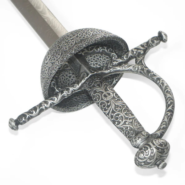 Splendide rapière factice pour jeux de rôle Grandeur Nature, avec un niveau de finition et de réalisme très élevé. Coque élégante et gravée, lame imitation damas, c'est une arme d'un grand raffinement, avec une bonne prise en main et un bon équilibrage !