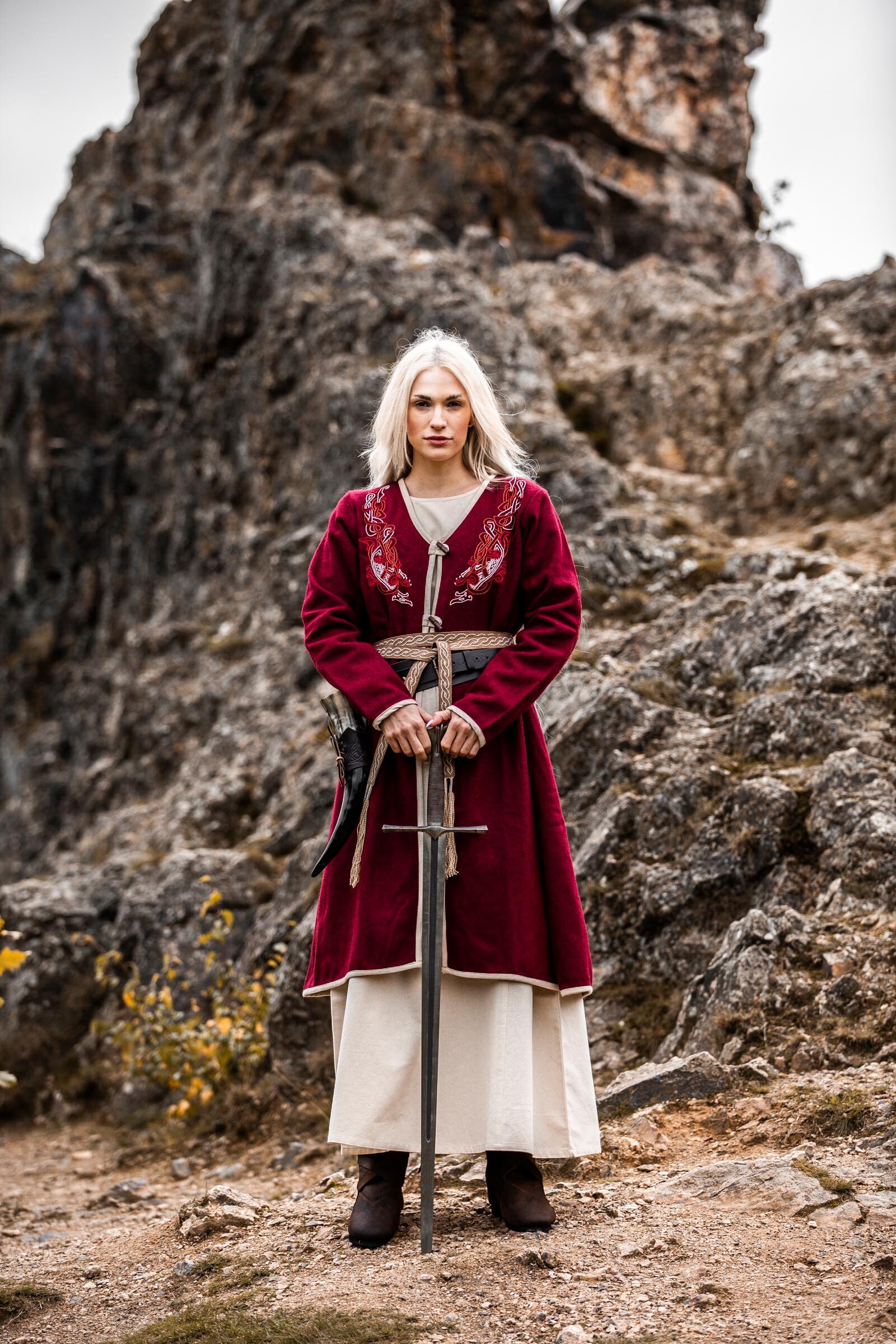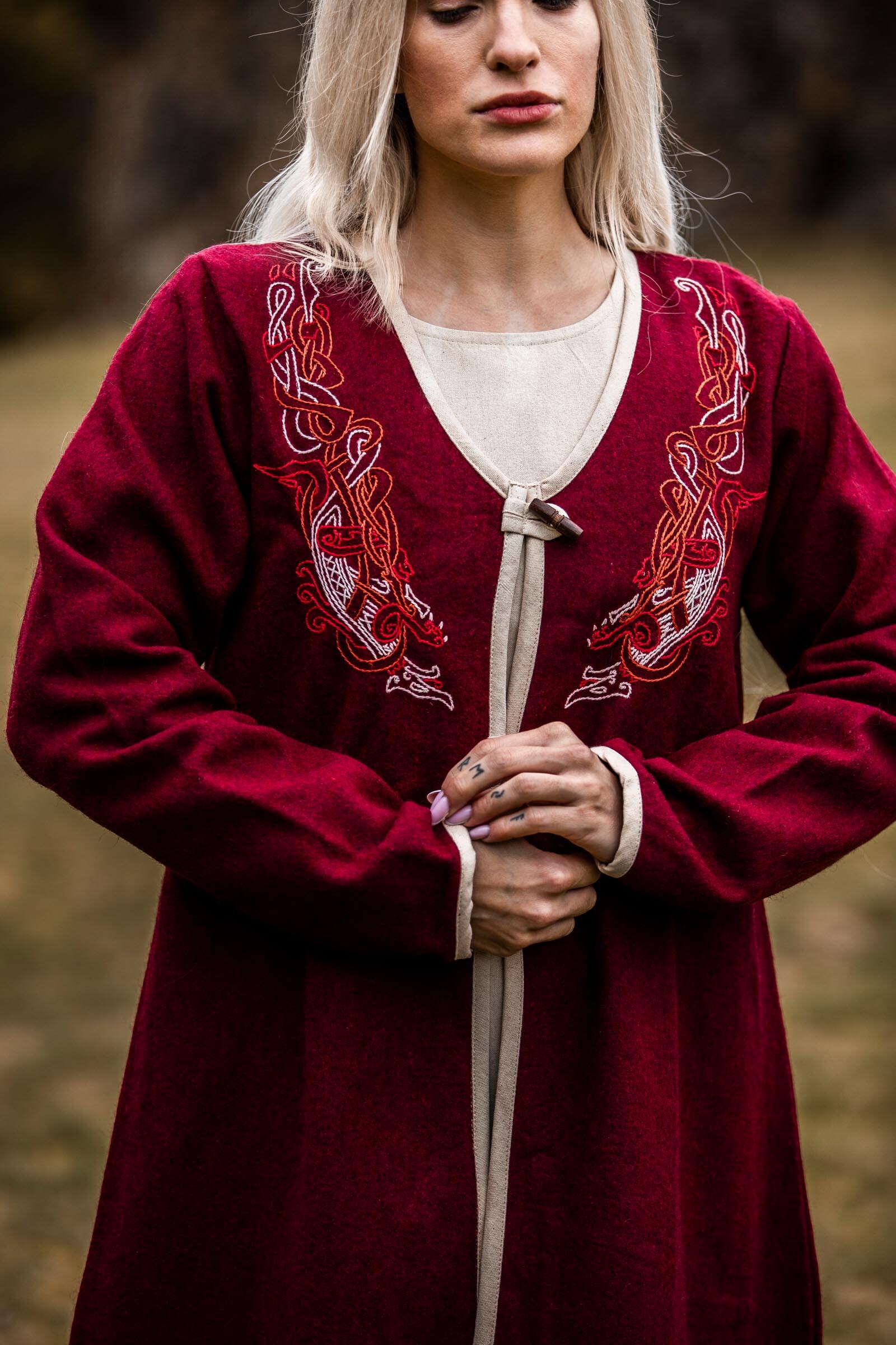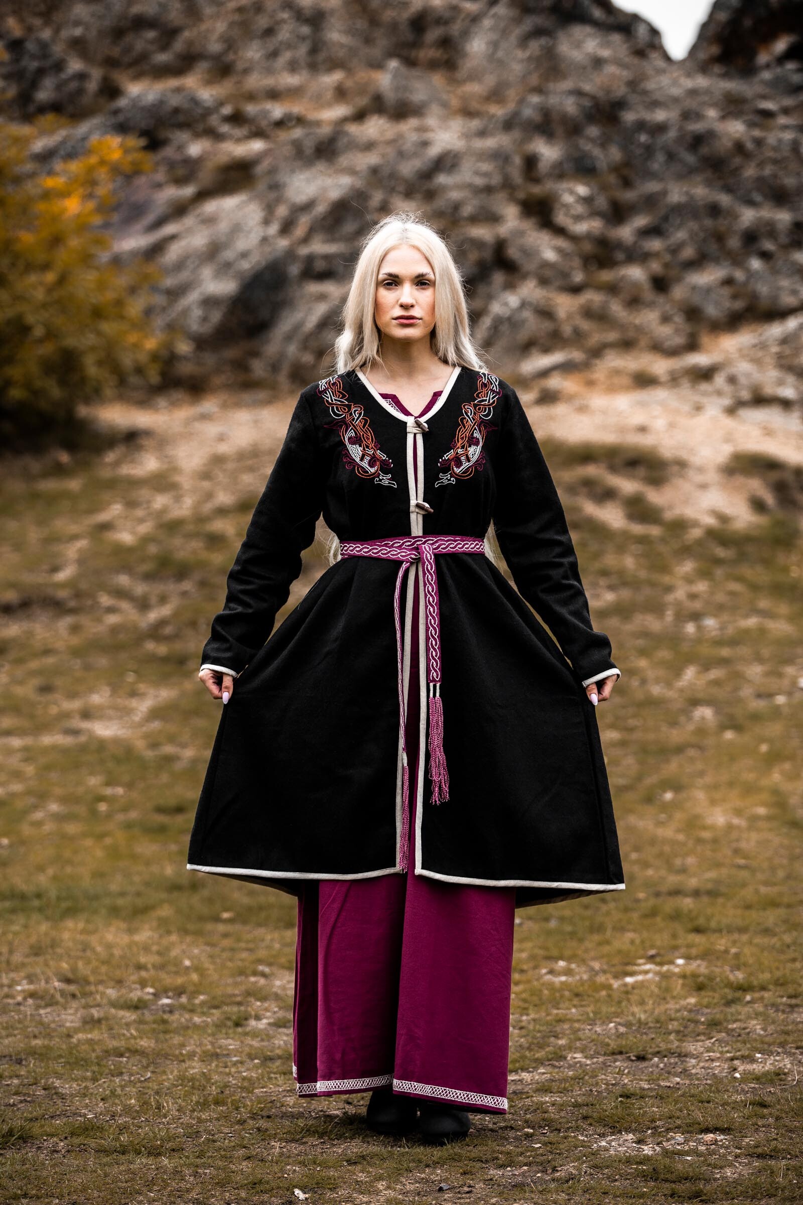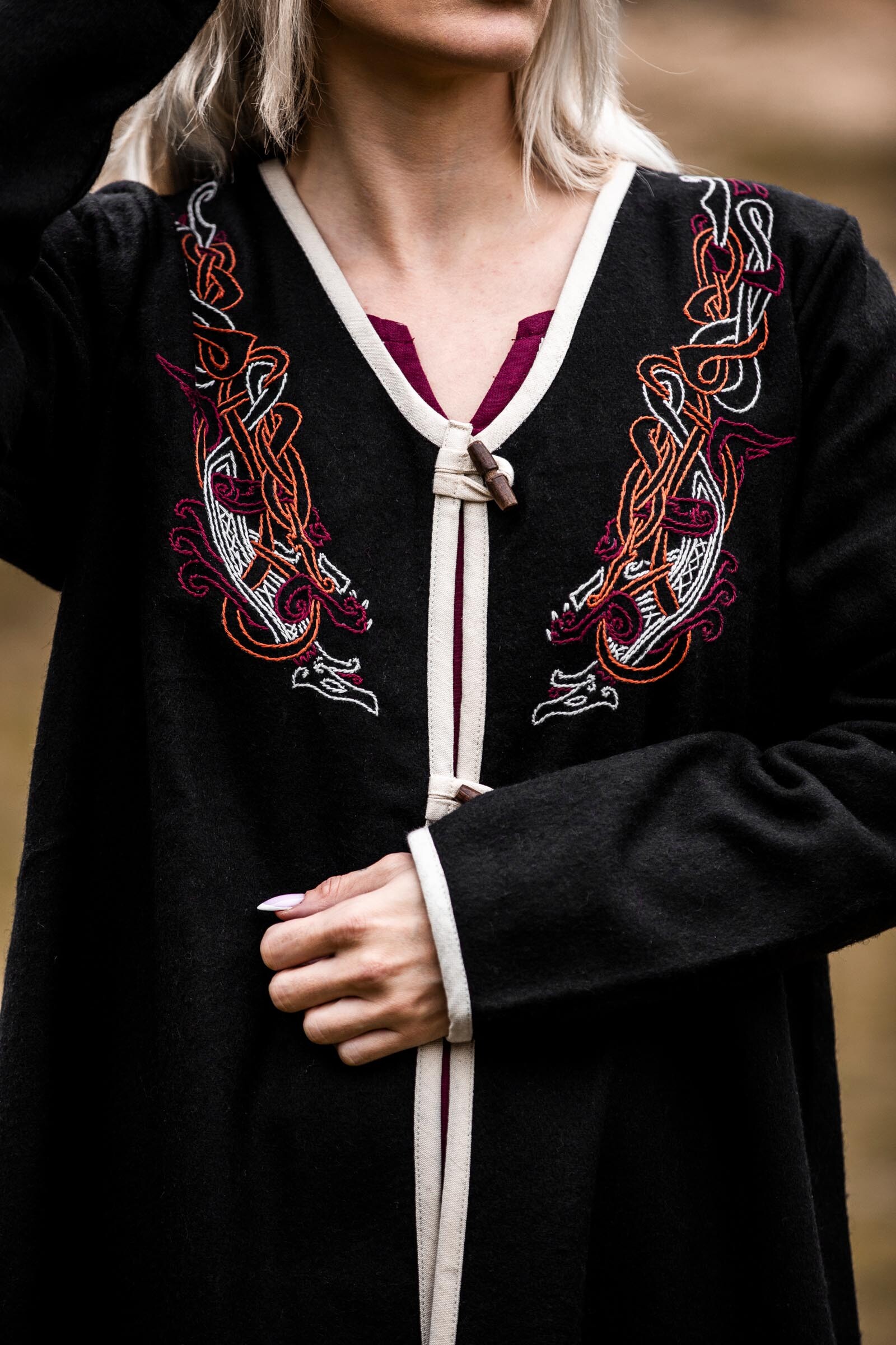Manteau chaud d'inspiration viking pour femme, avec broderies réalisées à la main (ne comprend pas sous-robe, ceinture, etc).