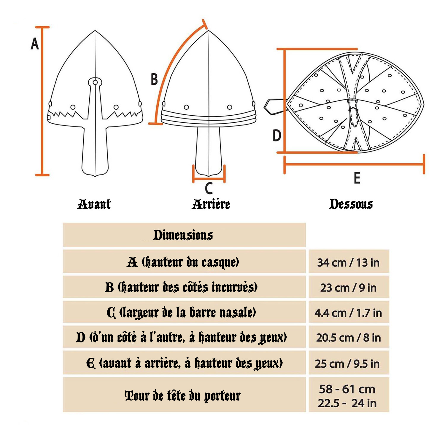 Casque destiné à être porté en costume, ou utilisé en décoration. Son épaisseur et sa forme seront insuffisantes pour assurer votre sécurité en combat avec des armes en acier.