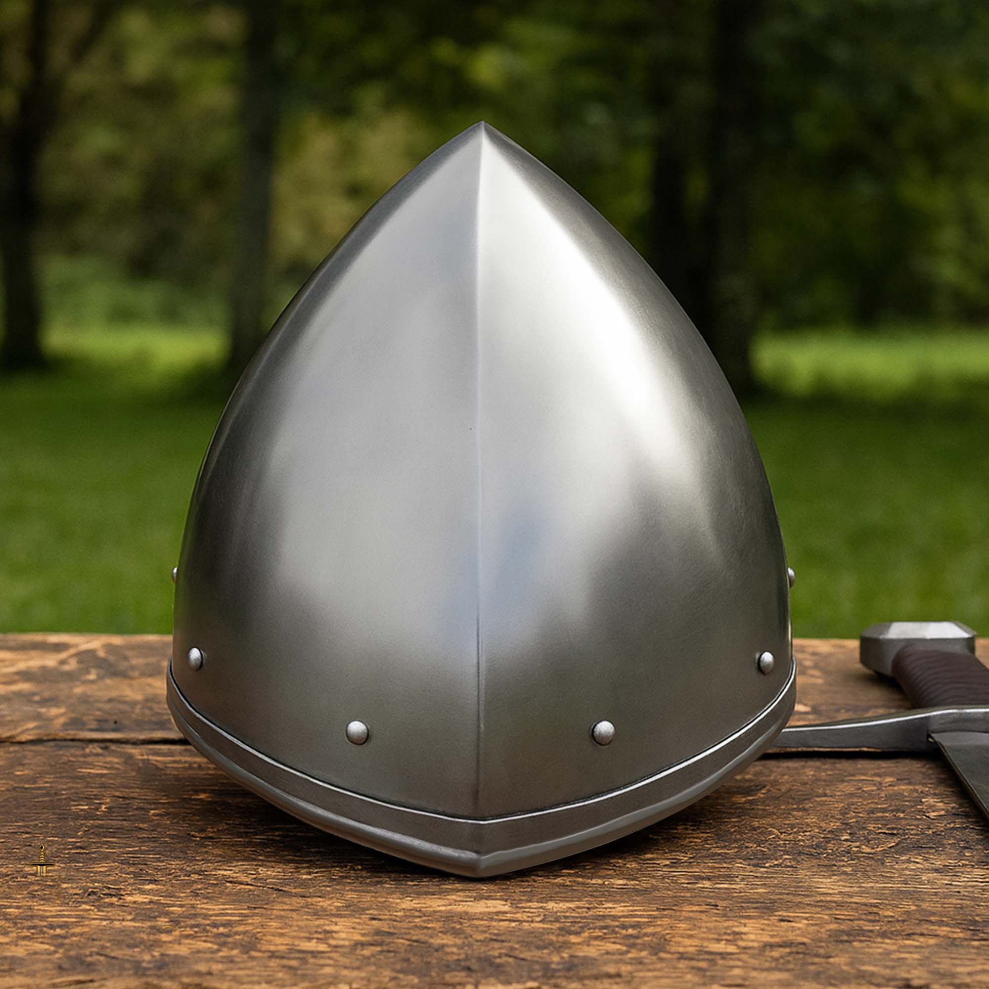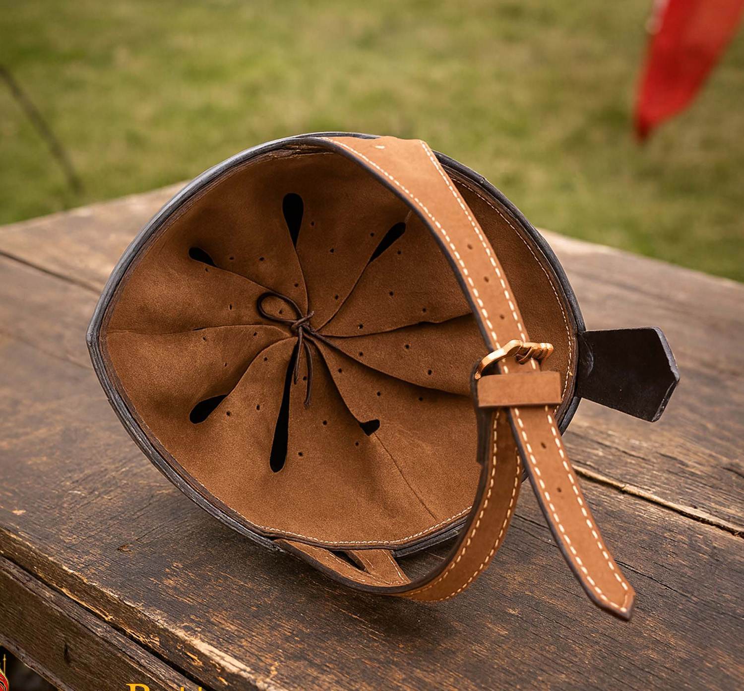 Ce casque est équipé à l'intérieur d'une araignée en cuir (pour régler l'enfoncement) et d'une sangle jugulaire. Nous recommandons l'ajout d'un cale gamboisé (voir notre section protections / gambisons) et d'un camail.